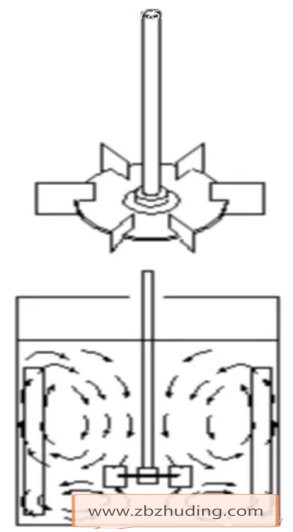 流体流动方向垂直于搅拌轴,沿径向流动,碰到容器壁面分成二股流体分别向上、向下流动,再回到叶端,不穿过叶片,形成上、下二个循环流动。