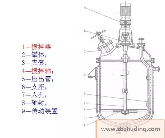 反应釜由釜体、釜盖、夹套、搅拌器、传动装置、轴封装置、支承等组成